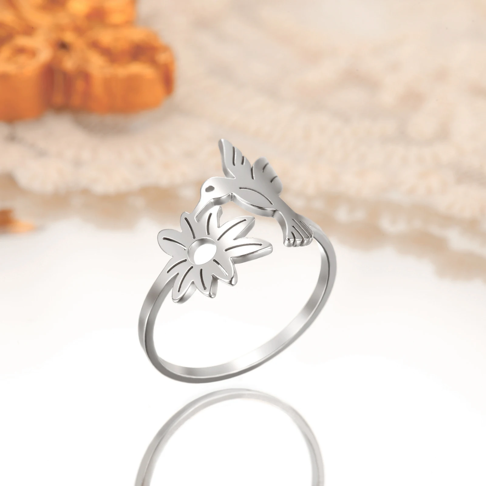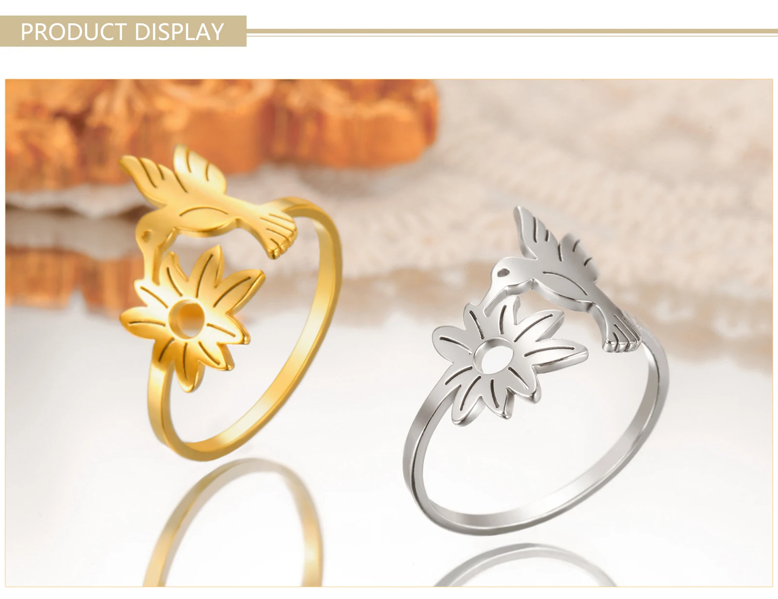 Skyrim Women Hummingbird Flower Rings Stainless Steel Gold Color Finger Rings Trendy Aesthetic Animal Jewelry Gift Wholesale